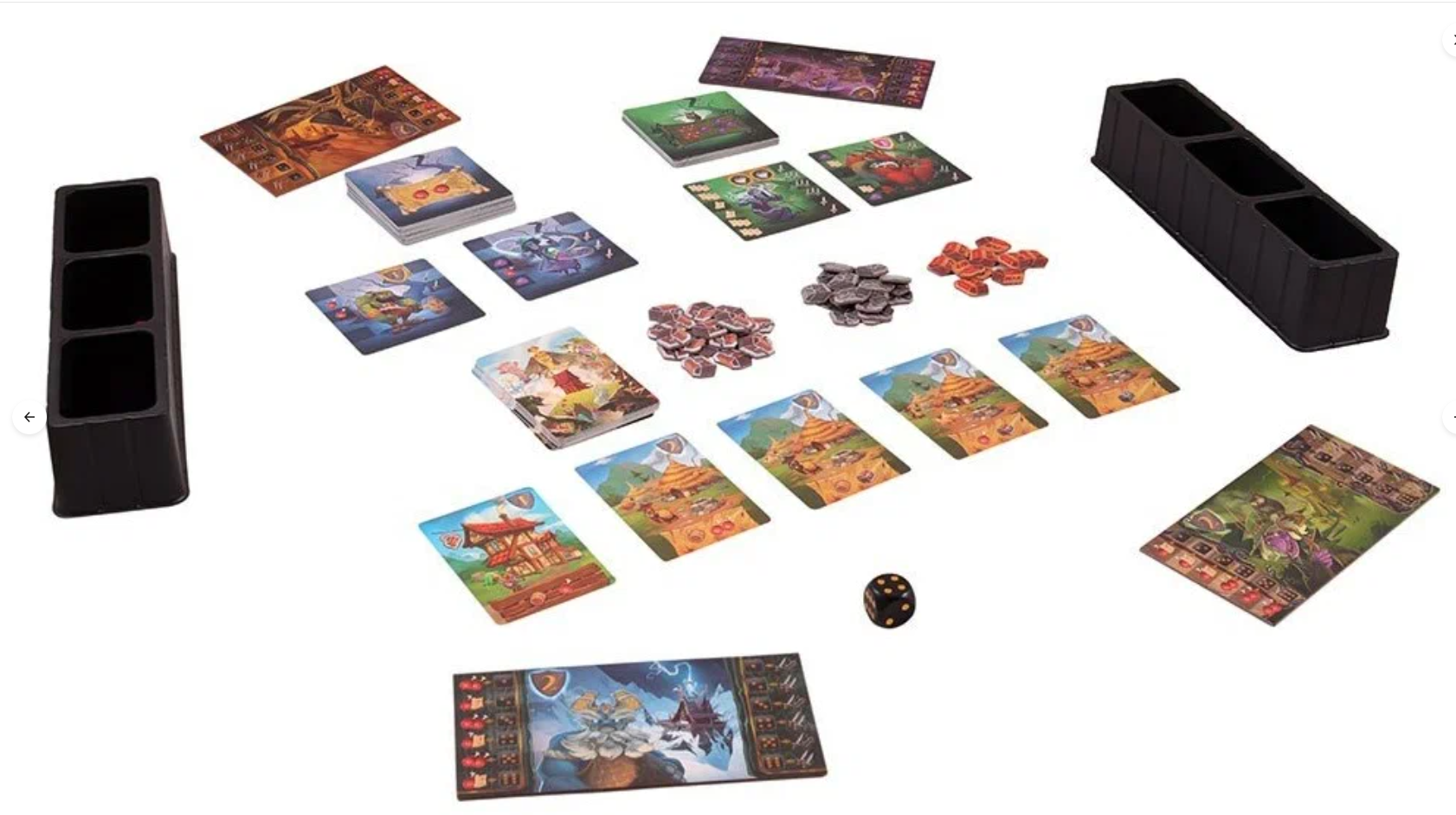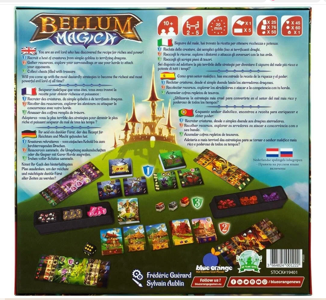 Настольная игра Bellum Magica – это простая стратегическая карточная игра, в которой каждый из игроков берёт на себя роль Тёмного владыки. У вас есть свой замок и орда злобных существ, которая каждый раунд будет приносить ресурсы и атаковать деревни жителей, а также, если вы пожелаете, может напасть на замок другого игрока. Цель игры проста: вы должны награбить как можно больше сундуков с сокровищами. В начале игры всем раздаются по 2 карты гоблинов, у каждой из которых есть по 2 способности: слева добыча ресурсов, справа – атака и оборона. Вы должны расположить полученные карты по бокам от своего замка в зависимости от того, какие способности гоблинов вы хотите использовать. Далее броском кубика определяется, какая орда будет активна в текущем раунде. После этого все игроки ходят по очереди: сначала собираются ресурсы, затем подсчитываются собранные разведчиками карты с сокровищами – у кого из игроков больше, тот получает сундук. Затем в порядке очереди все игроки предпринимают по одной атаке: либо напасть на деревню, либо на другого игрока. После атаки игроки могут нанять новых существ в свою армию (за ресурсы само собой). Игра заканчивается, когда один из игроков собирает 10 сундуков. Но это вовсе не значит, что он победил; ценность у всех сундуков разная, она указана на обратной стороне жетона, которая закрыта от остальных игроков (кроме вас). Вы подсчитываете именно ценность. У кого получилась сумма больше всех, тот и становится самым богатым Тёмным лордом!