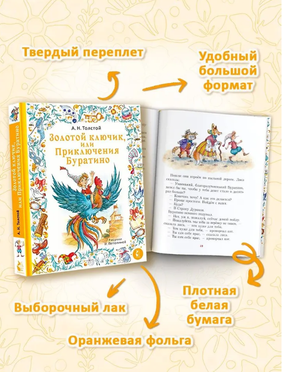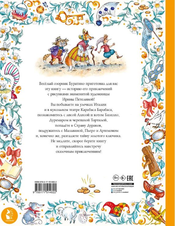 Знаменитая сказка А. Н. Толстого оживает в новых иллюстрациях известной художницы Ирины Петелиной! Весёлый и озорной Буратино всюду суёт свой длинный нос: и в холст, и в чернила, и в неприятности. С помощью верных друзей он справится со страшным Карабасом Барабасом и обязательно разгадает тайну Ключика, спрятанного на дне пруда. Скорее берите книгу и присоединяйтесь к приключениям! Вы побываете на улочках Италии и в кукольном театре Карабаса Барабаса, познакомитесь с лисой Алисой и котом Базилио, Дуремаром и черепахой Тортиллой, попадёте в Страну Дураков, подружитесь с Мальвиной, Пьеро и Артемоном.