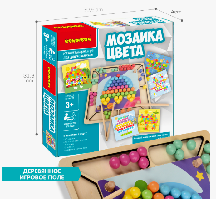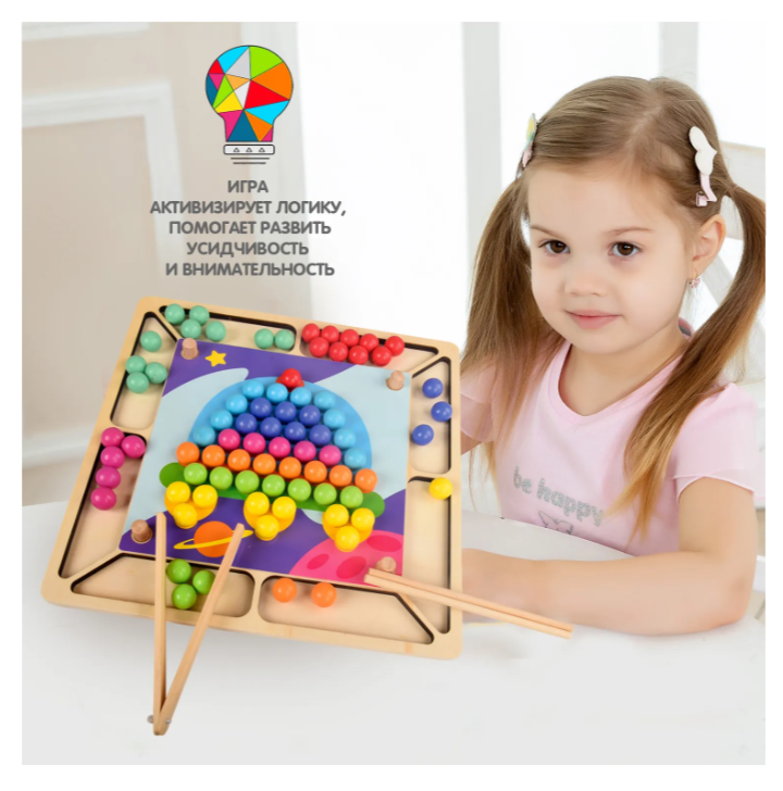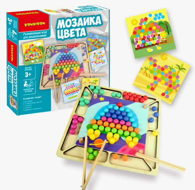 Деревянные головоломки идеально подходят для малышей и помогают им развивать творческие способности, логическое мышление и зрительно-моторную координацию. Процесс игр прост, но увлекательный. Выберите одну игровую карточку. Разместите ее на игровом поле так, чтобы отверстия совпадали. С помощью щипчиков возьмите шарик, назовите его цвет и вставьте в соответствующую лунку. Этот процесс помогает изучать цвета, улучшать тактильные ощущения и развивать мелкую моторику рук. В комплекте: деревянное игровое поле, 80 разноцветных шариков, щипчики и палочки для работы с мелкими деталями, 15 тематических карточек с готовыми заданиями. Предназначен ребенку от 3 лет. Игрушка выполнена из дерева, что говорит о ее высоком качестве и долговечности. Мазайка цвета - это настоящий нейротренажер для маленьких исследователей, он помогает формированию умственных способностей и творческому развитию ребенка. Работа с щипчиками и шариками улучшает ловкость рук, а создание мозаик по картинкам и трафаретам развивает логические способности и стимулирует воображение. Головоломка подходит для индивидуальных заданий дома, в детском саду или школе.
