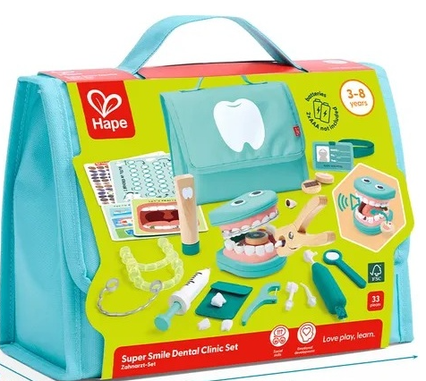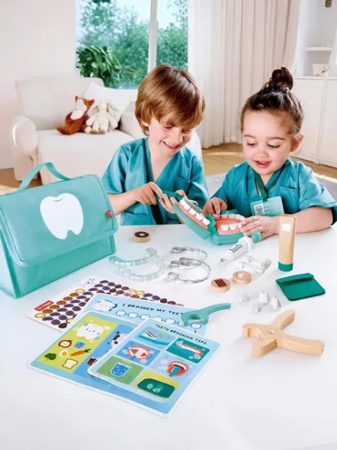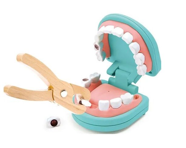 • Реалистичные инструменты: комплект включает зеркало, шприц, зубную нить и щипцы для удаления зубов, позволяющие имитировать посещение стоматолога и снизить страх перед врачами.