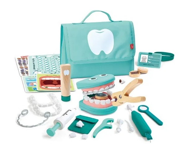 • Комплект инструментов для полной роли врача-стоматолога: помимо основных предметов имеются верхние и нижние ортодонтические пластинки, кусочки сладостей и даже именной бейджик.