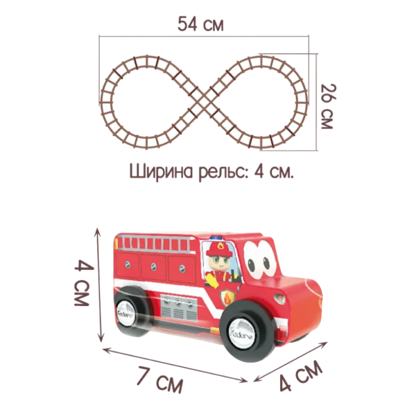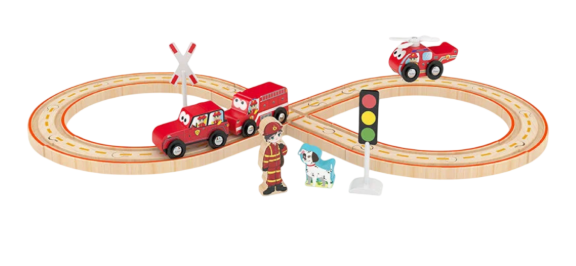 В набор входит игрушечная железная дорога, складывающаяся в «восьмёрку», фигурка пожарного, игровые аксессуары и 3 вида пожарных машин: внедорожник, вертолёт и стандартная пожарная машина. Со всеми этими деталями можно придумать множество интересных сюжетов и историй. Комплект совместим с разнообразными моделями железных дорог (Hape, Brio, Givito и т. д.).