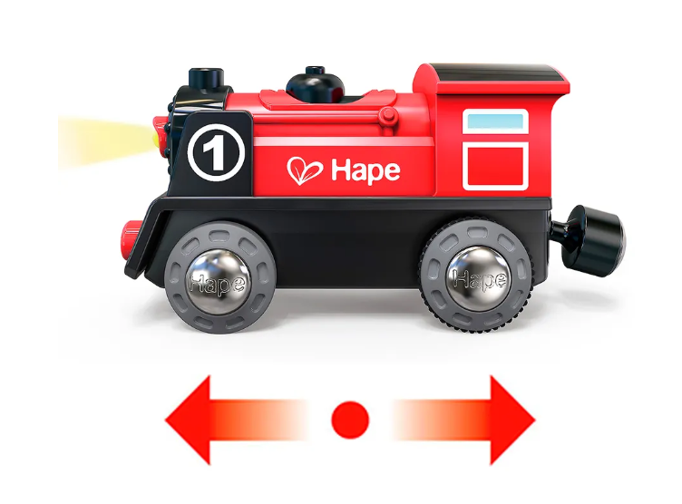 Паровоз имеет переднюю и заднюю передачи и легко управляется руками детей.
