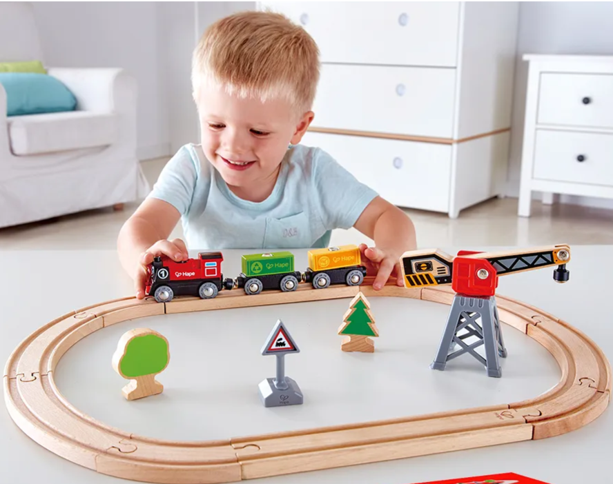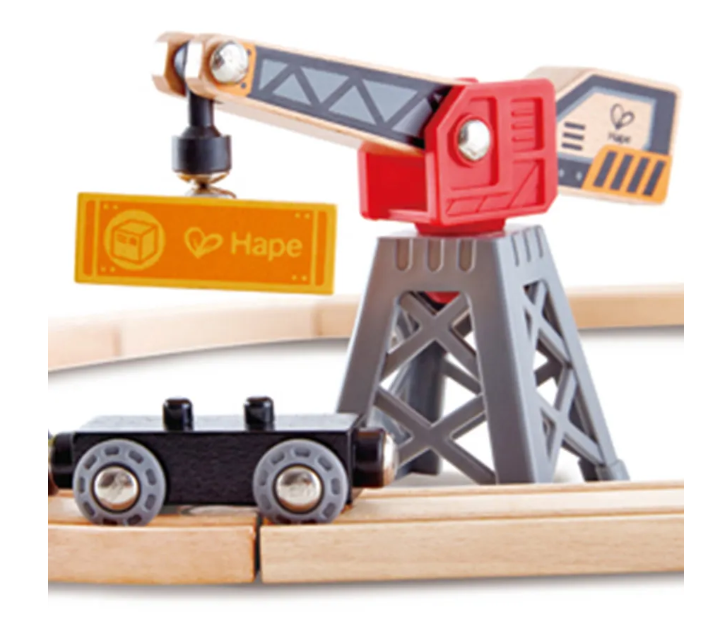 Набор поставляется с реалистичным краном, который поднимает и перемещает груз на и с поезда.