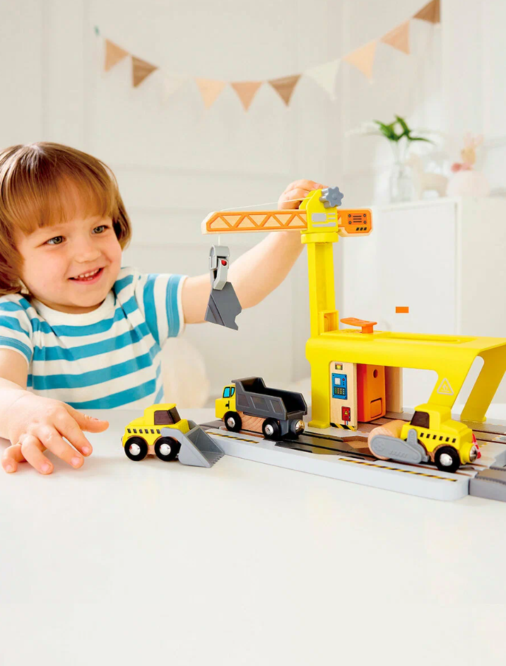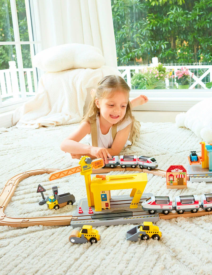 Этот уникальный игровой набор сочетает в себе элементы строительной техники и железнодорожной инфраструктуры, помогая детям развивать творческие и аналитические способности одновременно.