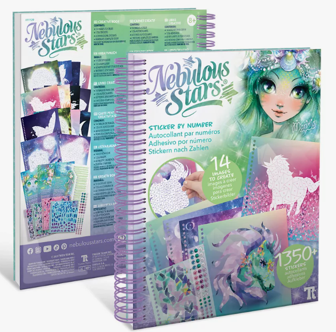 Набор для аппликаций по номерам. Создание 14 картин с помощью обычных наклеек и наклеек со стразами путем заполнения фрагментов рисунка соответствующими элементами, ориентируясь на номера, расположенные на эскизах и на страницах с наклейками. К набору прилагается подробная инструкция и буклет с историей звёздочки Marinia.