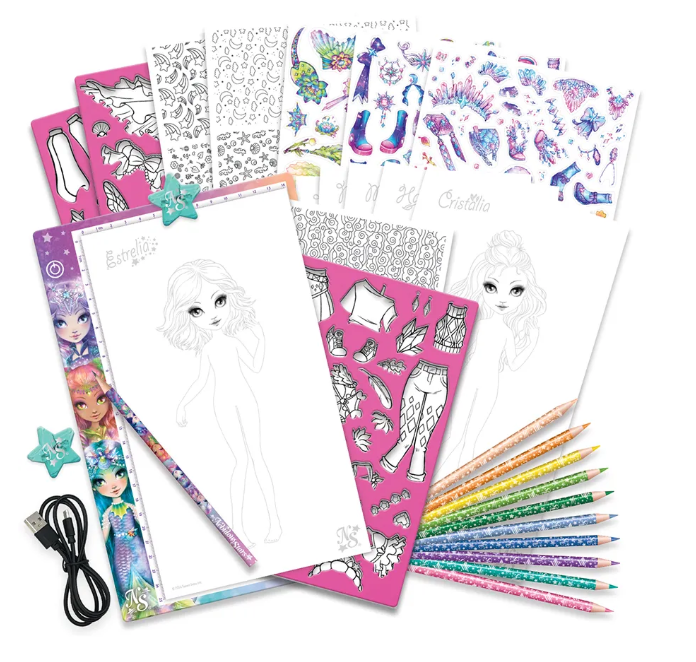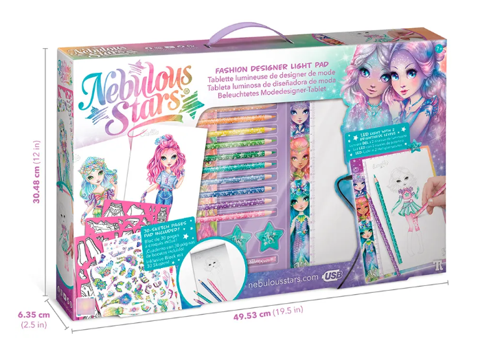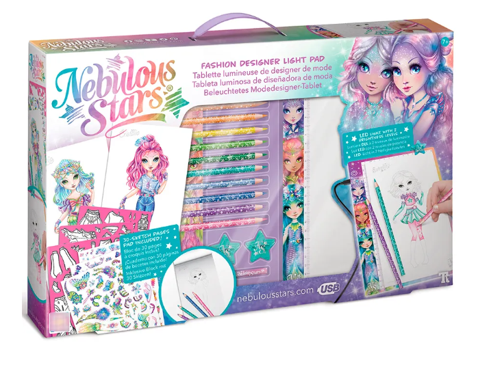 Набор для творчества Световой планшет Дизайнера от Nebulous Stars поднимет ваши дизайнерские навыки на новый уровень! Используйте трафареты и декоративные наклейки, чтобы создавать восхитительные наряды для очаровательных Звёздочек из Мерцающей туманности. Световой планшет экстремально тонкий и лёгкий. Толщина планшета всего 5 мм, что делает его портативным, стильным и удобным в использовании. Он подходит для копирования, каллиграфии, дизайна и рисования, и поможет воплотить в жизнь самые креативные идеи. В планшет встроены светодиоды с двумя уровнями яркости: настройка света позволит подобрать оптимальный режим для работы. Благодаря различным инструментам и материалам, входящим в комплект, дети получают возможность экспериментировать с дизайном, пробовать разные техники рисования и проектирования, что стимулирует воображение и развивает способность выражать свои идеи через искусство.