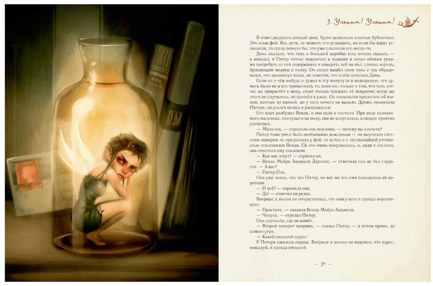 Удивительная история о сказочном мальчике, который не хотел взрослеть, давно поразила воображение детей и взрослых. Она началась с того, что однажды Питер Пэн влетел в окно детской в доме, где жили девочка Венди и двое её братьев. Вместе с Питером они отправились на далёкий волшебный остров. Там им встретились русалки, храбрые индейцы, озорная фея и даже пираты с их злобным главарём капитаном Крюком, судьба которого окажется в руках летающего мальчика. И тут героев ждут захватывающие приключения. Этой знаменитой книге особое очарование придают великолепные иллюстрации, созданные выдающимся художником к столетию первого издания «Питера Пэна».