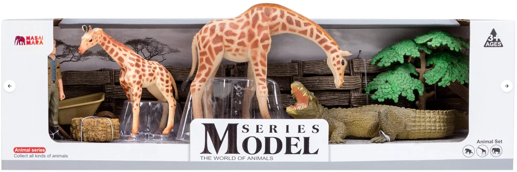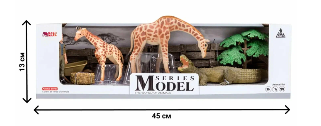 Игровой набор Masai Mara Мир диких животных: 2 жирафа, крокодил, фермер, дерево, тачка, сено, забор
