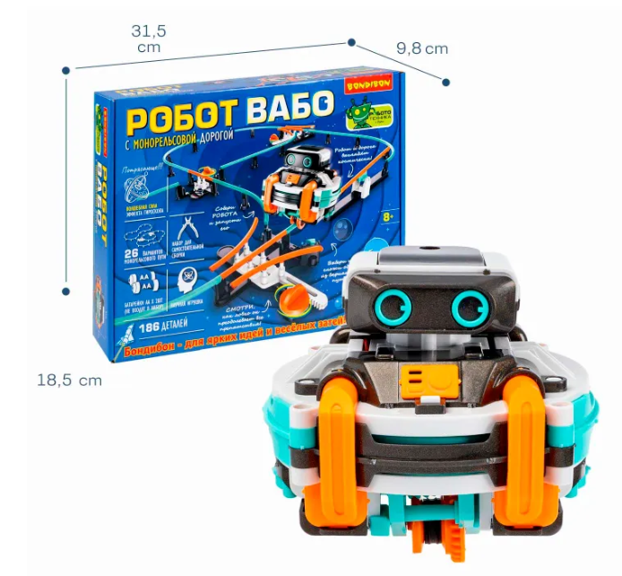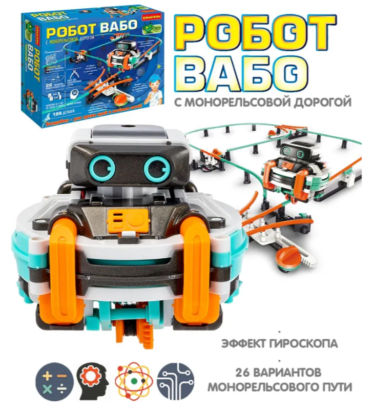 Робот ВАБО с монорельсовой дорогой Bondibon серии «Робототехника с Буки» — инновационный STEM-набор для юных изобретателей. Собери робота, который движется по монорельсу на одном колесе по принципу гироскопа!  Он набирает скорость, останавливается и меняет направление — настоящее чудо инженерии!