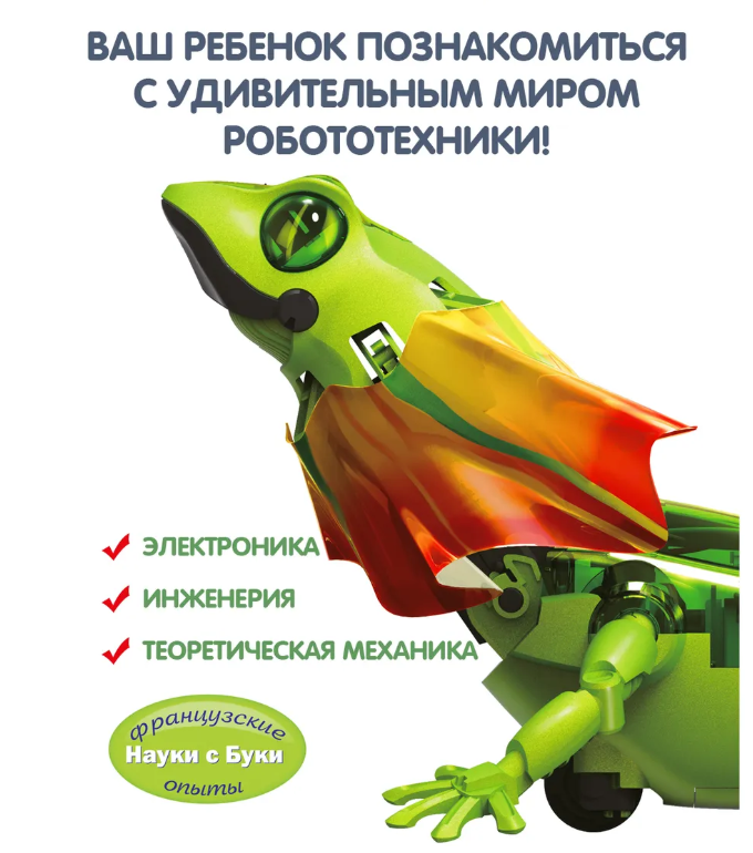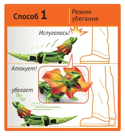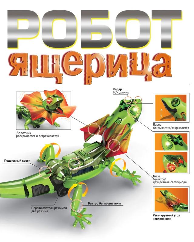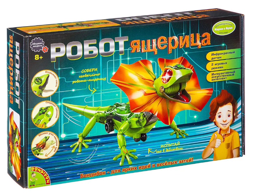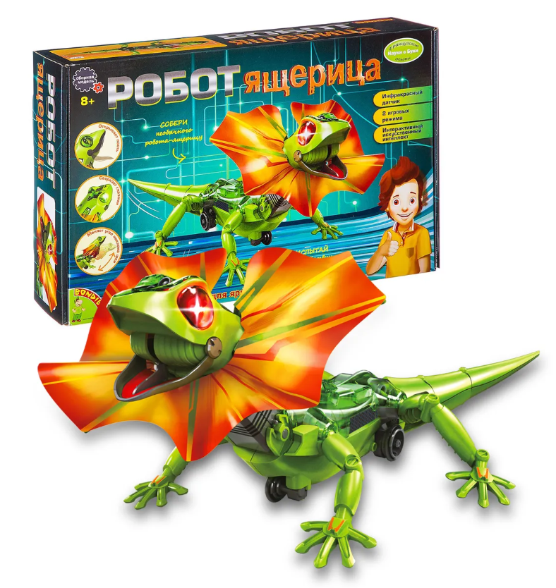 Интерактивный робот Ящерица серии Робототехника от Bondibon - это увлекательный набор, который познакомит детей с принципами работы сенсоров , движения и электроники в игровой форме. Такая игрушка развивает у ребенка логику, мелкую моторику и познавательный интерес к устройству умной техники. Следуя инструкции, соберите умную модель робота. Выберите один из двух режимов управления с помощью переключателя. В интерактивном режиме преследования ящерица пытается напугать, распахнув воротник, и бегает за ногами, как домашний питомец. В режиме убегания, благодаря инфракрасному датчику , робот, столкнувшись с препятствием, сверкает красными глазами и отходит на безопасное расстояние. А еще фигурка открывает пасть, двигает хвостом, шеей и быстро перемещается. В комплекте: 95 деталей, инструкция со схемой сборки .
