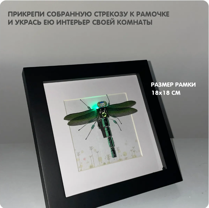 Удивительная кибер стрекоза из будущего не летит на свет, она сама светится в темноте! Сделать удивительное насекомое сможет любой обладатель набора для творчества.   Соберите статическую модель Картина Кибер - стрекозы из электронных компонентов, прикрепите ее к деревянной рамке из набора и украсьте ею комнату. Конструктор развивает усидчивость, внимание, мелкую моторику, кругозор, образное мышление, зрительное восприятие и фантазию. Каждый ребенок – художник и математик, писатель и ученый, артист и отважный исследователь неизвестных миров, воин и композитор. Маленькое самоуверенное чудо смело берется за любое дело, лишь бы оно не было скучным – и действительно демонстрирует способности в самых разных областях деятельности! Поэтому так важен выбор детских развлечений и игрушек для девочек и мальчиков. Лучшие игрушки помогут раскрыться талантам маленького человека и разовьют у него множество полезных навыков. Даже простой игрушечный автомобиль в детских руках становится источником ценной информации. А более сложные игры открывают перед ребенком целый мир! Сборная фигурка конструктор, пазл из множества мелких металлических деталей, для сборки которого нужен клей, возможно, и не пробудит тяги к художественному творчеству у Вашего малыша. Но эффект от этой игры будет достигнут. Такой набор познакомит ребенка с творческой работой, раскроет для него мир робототехники и позволит самостоятельно создать поделки, заслуживающие одобрения взрослых и сверстников.