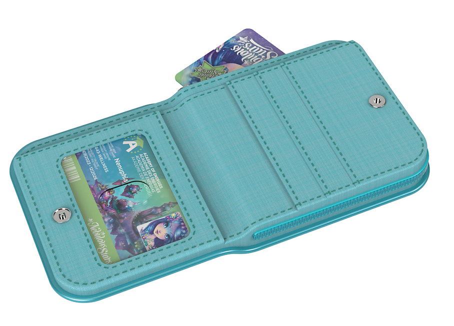 Кошелёк для девочки с ярким запоминающимся дизайном. Включает отделение для монет (на молнии), несколько кармашков для кредитных карт и отделение для бумажных денег. Кошелёк складывается пополам и застёгивается на кнопку.