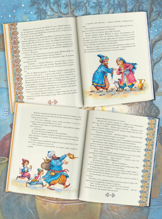 В книгу вошли два величайших шедевра арабской литературы – «Аладдин и волшебная лампа» и «Али-Баба и сорок разбойников» в классическом переводе знаменитого востоковеда и филолога Михаила Александровича Салье (1899–1961). Михаил Салье – первый и единственный в России, кто перевёл сказки «Тысячи и одной ночи» с языка оригинала. Первый том сказок был выпущен в 1929 году, а последний, восьмой, в 1939 году. В этой книге представлен адаптированный текст для детей, который сделал сам переводчик. Роскошные иллюстрации Ирины Петелиной отлично дополняют текст и переносят читателей в загадочный мир арабских чудес!