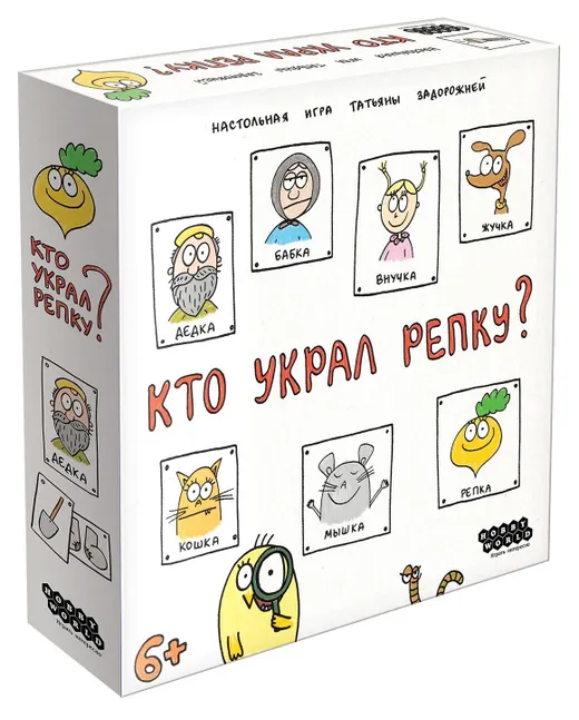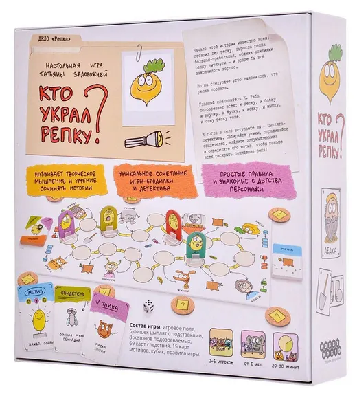 В игре "Кто украл репку?" вы берёте на себя роли этих самых цыплят. Задача каждого игрока – составить точную картину преступления, определив похитителя, сообщника и мотив. Может, дед возомнил, что является единоличным владельцем репки? Или внучка решила присвоить себе злополучный корнеплод? А вдруг сама репка состоит с кем-то в криминальном сговоре? Узнать это вам предстоит, перемещаясь по полю и собирая карты следствия. Найдите улики, узнайте приметы преступника, опросите свидетелей и составьте на основе имеющейся информации складную историю. Но помните: шанс определить похитителя у каждого игрока только один. Если цыплёнок по неосторожности обвиняет невиновного, его отстраняют от расследования.